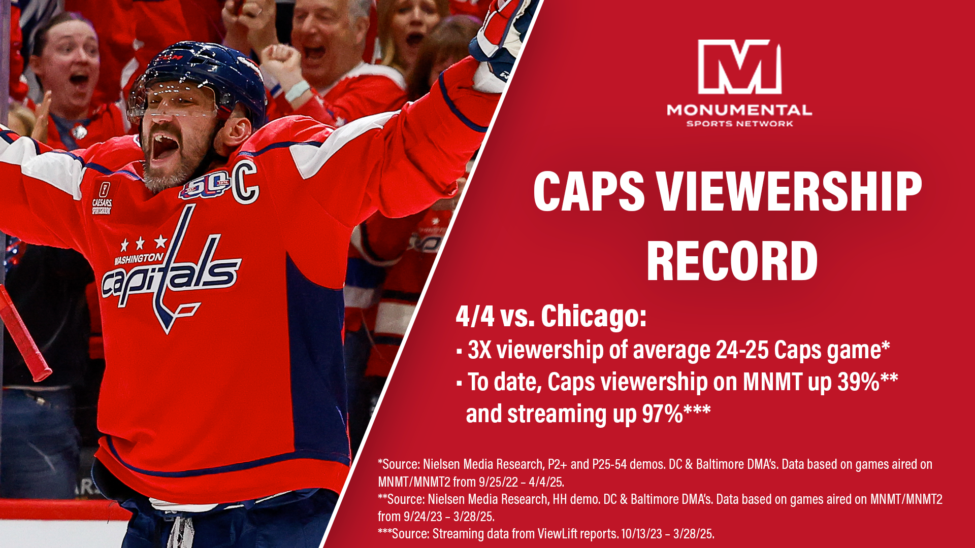 Through the first 72 games of the current season, local TV viewership for Washington Capitals games has increased 39% in the D.C. and Baltimore markets compared to last season. Similarly, the demand for Capitals pre- and postgame programming has also increased significantly year-over-year, up 28% and 53% respectively. (Source: Nielsen Media Research, HH demo. DC & Baltimore DMA’s. Data based on games aired on MNMT/MNMT2 from 9/24/23 – 3/28/25.)