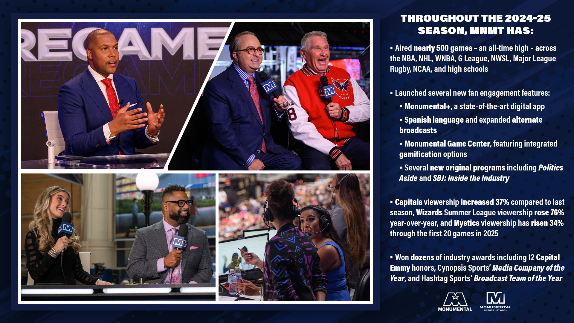 Washington, D.C. (July 25, 2025) – Monumental Sports Network (MNMT) is proud to celebrate a transformative second season as the exclusive local broadcast home of the NHL’s Washington Capitals, NBA’s Washington Wizards, WNBA’s Washington Mystics, and NBA G League’s Capital City Go-Go. Over the past year, MNMT has cemented its position as a trailblazer in the regional sports media industry, redefining the way fans in the DMV region experience their favorite teams through bold innovations, immersive fan engagement features, and a relentless commitment to premium programming. Monumental Sports & Entertainment (MSE) took the bold approach to reinvest in its local media rights and acquired NBC Sports Washington in August 2022, subsequently rebranding the network as MNMT in June 2023.