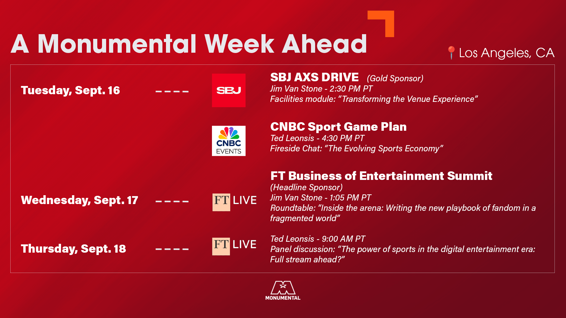 “Following the momentum from our Nasdaq leadership event, these Los Angeles engagements put Monumental at the forefront of global sports and entertainment, advancing our strategy, deepening industry relationships, and demonstrating the full impact of our innovation,” said Van Stone. “We’re excited to showcase Monumental’s expertise this week and look forward to leading the conversation at future premier industry forums around the world.”